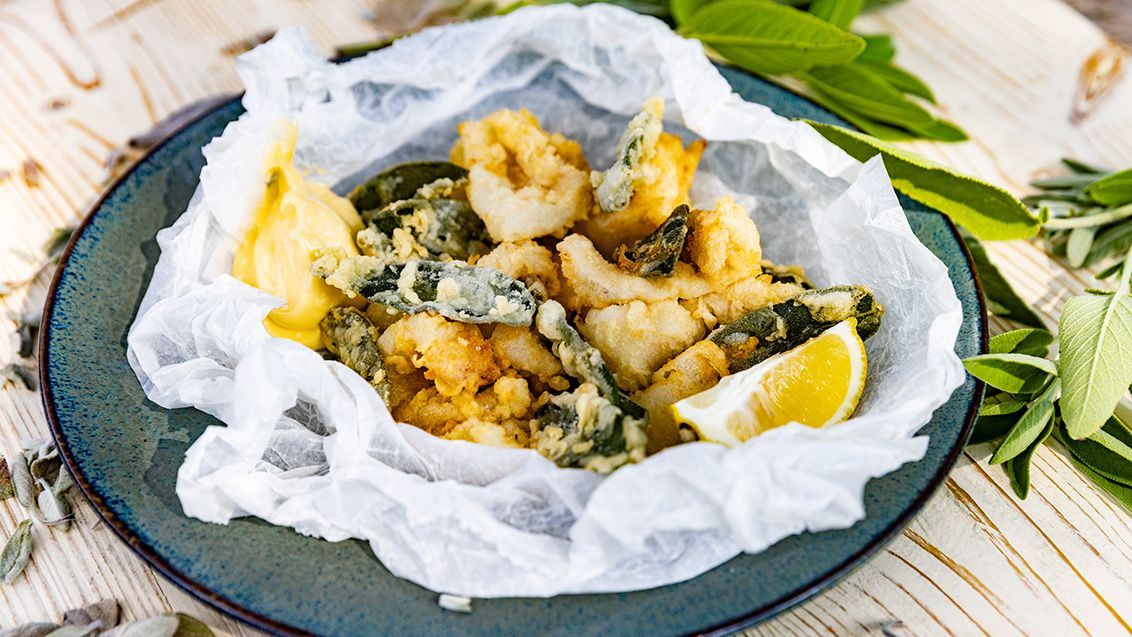 3. Očištěné a na poloviny nakrájené kalamáry a šalvěj dobře osušíme, obalíme v mouce, v těstíčku a poté znovu v mouce. Smažíme v pánvi s olejem rozehřátým na 180 °C, dokud nejsou zlatavé a křupavé. Necháme okapat na papírové utěrce.